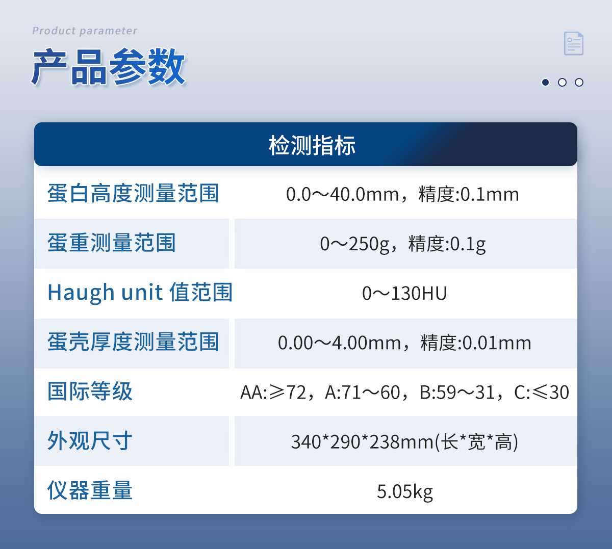 | 1.儀器采用7英寸液晶觸摸屏,搭配運行安卓智能操作系統,主控芯片采用ARM Cortex-A7,RK3288/4核處理器,主頻1.88Ghz,操作方便,性能更強。 | 2.儀器采用智能化控制,可一鍵自動測量蛋重、蛋白高度、新鮮度(哈夫單位)、蛋黃高度、蛋殼厚度。 | 3.高精度數字傳感器,測量結果精度高,穩定性好。 | 4.創新采用高精超聲波傳感器測試蛋白高度,精密傳感器測試蛋黃顏色,無需直接接觸蛋液,減少誤差存在。 | 5.儀器測試性能穩定,不受操作人員的能力影響,方便簡單。 | 6.可一鍵自動測量哈夫單位、蛋重、蛋白高度、蛋黃高度和蛋殼厚度,把測試時間縮短到 17 秒。 | 7.儀器可本機存儲數據,可連接USB端口將數據導出存儲。另外,儀器自帶數據上傳模塊,具有WIFI聯網上傳、RJ45網線連接功能,數據可實現局域網和互聯網數據上傳,檢測結果可選擇直接傳至數據平臺,進行大數據分析處理與數據統計,達到長期分析監測的目的。 | 8.打印系統:內置全新打印機,可以打印項目名稱、二維碼、抽樣信息、檢測信息、受檢信息、復核信息、抽樣日期、檢測日期等信息。 | 9.供電模式:儀器交直流兩用,直流12V供電(標配),可連接車載電源,亦可選配6ah大容量充電鋰電池,方便戶外流動測試。 | 10.儀器具有重新校準、鎖定功能。 | 11.檢測指標: | (1)蛋白高度測量范圍:0.0~40.0mm,精度:0.1mm ; | (2)蛋重測量范圍:0~250g,精度:0.1g ; | (3) Haugh unit 值范圍:0~130HU; | (4)國際等級:AA:≥72,A:71~60,B:59~31,C:≤30; | 12.外觀尺寸:340*290*238mm(長*寬*高),儀器重量:5.05kg。 |