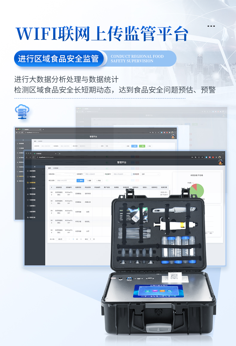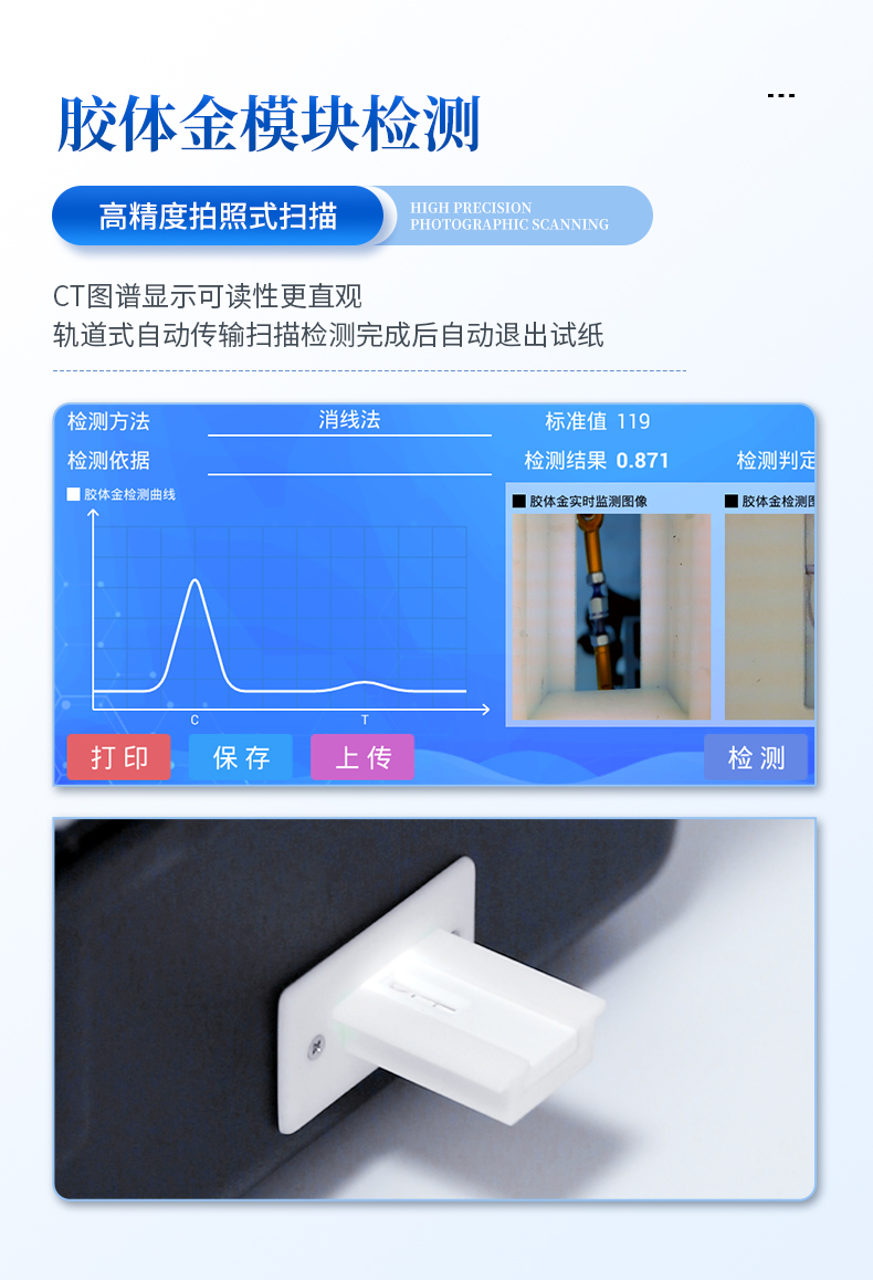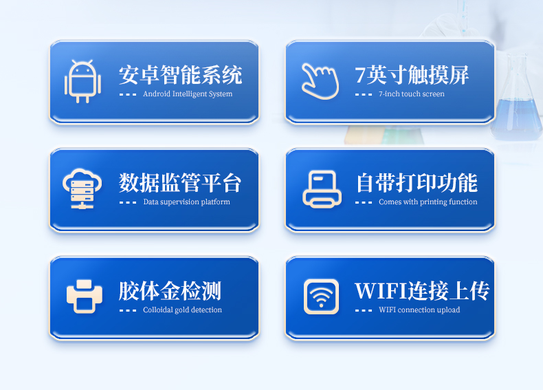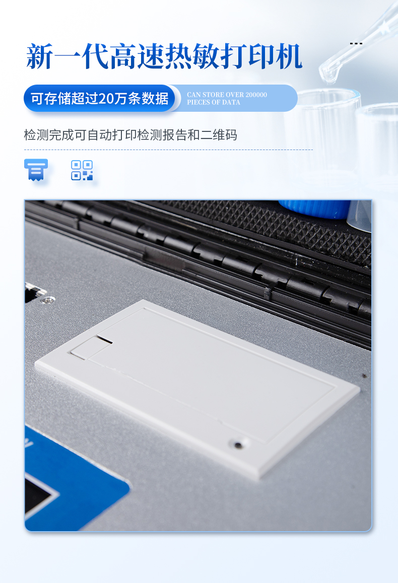 | 安卓智能操作系統,采用更加**和人性化操作,儀器具有網線連接、wifi聯網上傳、4G無線遠傳功能,快速上傳數據。 | 智能化程度高,儀器具有自檢功能:具有開機自檢和調零功能,具有自動檢測重復性功能。 | 新一代高速熱敏打印機,檢測完成可自動打印檢測報告和二維碼。 | 儀器帶有監管平臺。數據可局域網和互聯網數據上傳,檢測結果直接傳至食品安全監管平臺。進行區域食品安全監管及大數據分析處理與數據統計,檢測區域食品安全長短期動態,達到食品安全問題預估、預警。 | 一體化便攜式快檢設備,滿足現場及流動檢測使用需求,能夠在同一軟件下實現所有檢測項目的檢測,并可通過同一窗口直觀顯示檢測結果。 | 膠體金模塊檢測方式:軌道式自動傳輸掃描,檢測完成后自動退出檢測卡。 | CT線自動識別,無需手動調整。 | 儀器具有品類多種類樣品菜單庫,可靈活選擇檢測樣品,不同的檢測通道可同時檢測不同的樣品項目。 | 樣品處理簡單省力,整體操作快速、安全、便捷。 | 儀器具有自身保護功能,可設置用戶名及密碼,防止非工作人員操作等。 | 高靈敏度,高檢測精度,高重復性精度,掃描式高精度光學傳感器。 | 內置強大的數據庫,可在儀器上直接選擇樣品名稱、檢測指標、送檢單位等信息,也可在儀器上直接編輯錄入樣品名稱、檢測指標、送檢單位等信息并保存進樣品數據庫。 | 儀器具有重新校準、鎖定、恢復出廠設置功能。 | 支持U盤存儲。 結果判定線可修改,對照值標定值可保存,斷電不丟失數據。 | 兼容市場上所有的膠體金卡,使用耗材不受限制,極大增強用戶使用體驗。 |
