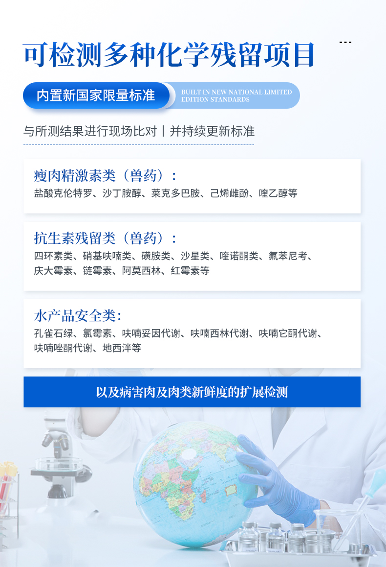 該儀器廣泛應用于食藥監局、衛生監督部門、農業部門、商業系統養殖場、屠宰場、食品肉產品深加工企業、畜牧獸醫、檢驗檢疫部門、食品生產企業、農副產品批發市場、農業生產基地、超市、餐廳、高教院校、食堂等單位部門對食品中的不安全指標進行監測使用。