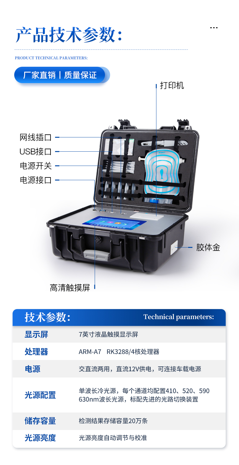 | 主控芯片采用ARM Cortex-A7,RK3288/4核處理器,主頻1.88Ghz,運轉速度更快速,穩定性更強。 | 顯示方式:7英寸液晶觸摸屏顯示,人性化中文操作界面,讀數直觀、簡單。 | 交直流兩用,直流12V供電,可連接車載電源,可配6ah大容量充電鋰電池,方便戶外流動測試。 | 光源亮度自動調節與校準 | 智能恒流穩壓,光強自動校準,長時間連續工作光源無溫漂現象。 | 內置新國家限量標準,與所測結果進行現場比對,并持續更新標準。 | 不間斷進樣,連續檢測 | 樣本編號自動累加。 | 檢測項目可擴充。 | 檢測結果可批量打印,批量上傳。 | 檢測結果為Excel表格,連接電腦即可拷貝。 | 檢測結果存儲容量20萬條 | 標準USB接口,免驅動安裝。 | 固件可升級 |