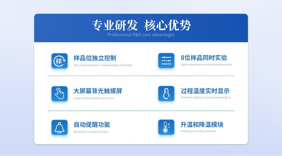 | ◆ 全樣品位:28位, | ◆ 可同時滿足制膠過程和冰水浴操作。制膠和冰水浴可在屏上獨(dú)立操控,互不影響。 | ◆ 制膠控制,通過無級控溫旋鈕控制加熱功率,安全制膠。 | ◆ 水位自動檢測功能:自動檢測水位,缺水自動停止。 | ◆ 自動進(jìn)排水:自動進(jìn)排水。 | ◆ 控溫精度:±0.1℃ | ◆ 沸點(diǎn)自動檢測 不同地區(qū)不同大氣壓下自動檢測當(dāng)下環(huán)境的沸點(diǎn),提醒加樣。 | ◆ 提醒功能: 沸水浴停止自動提醒 靜置結(jié)束自動提醒 冰水浴冷卻結(jié)束自動提醒 冰水浴溫度過高加冰提醒 沸水到溫提醒制膠開始。 | ◆ 大屏幕背光觸摸屏,方便直觀操作。 |