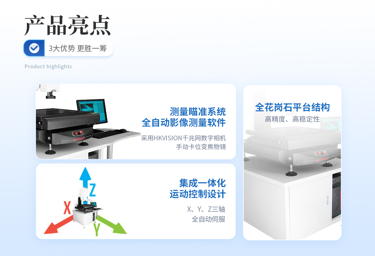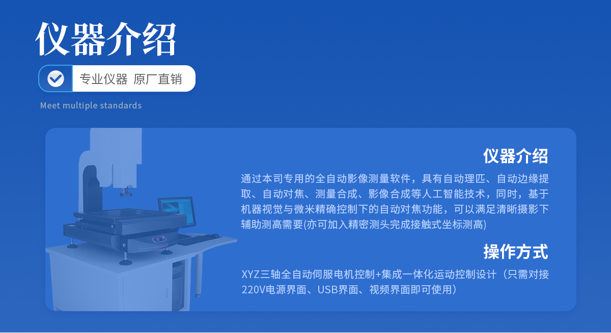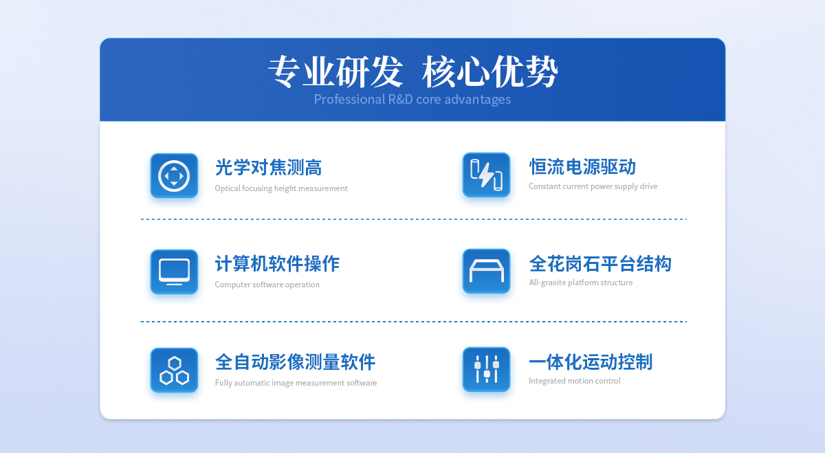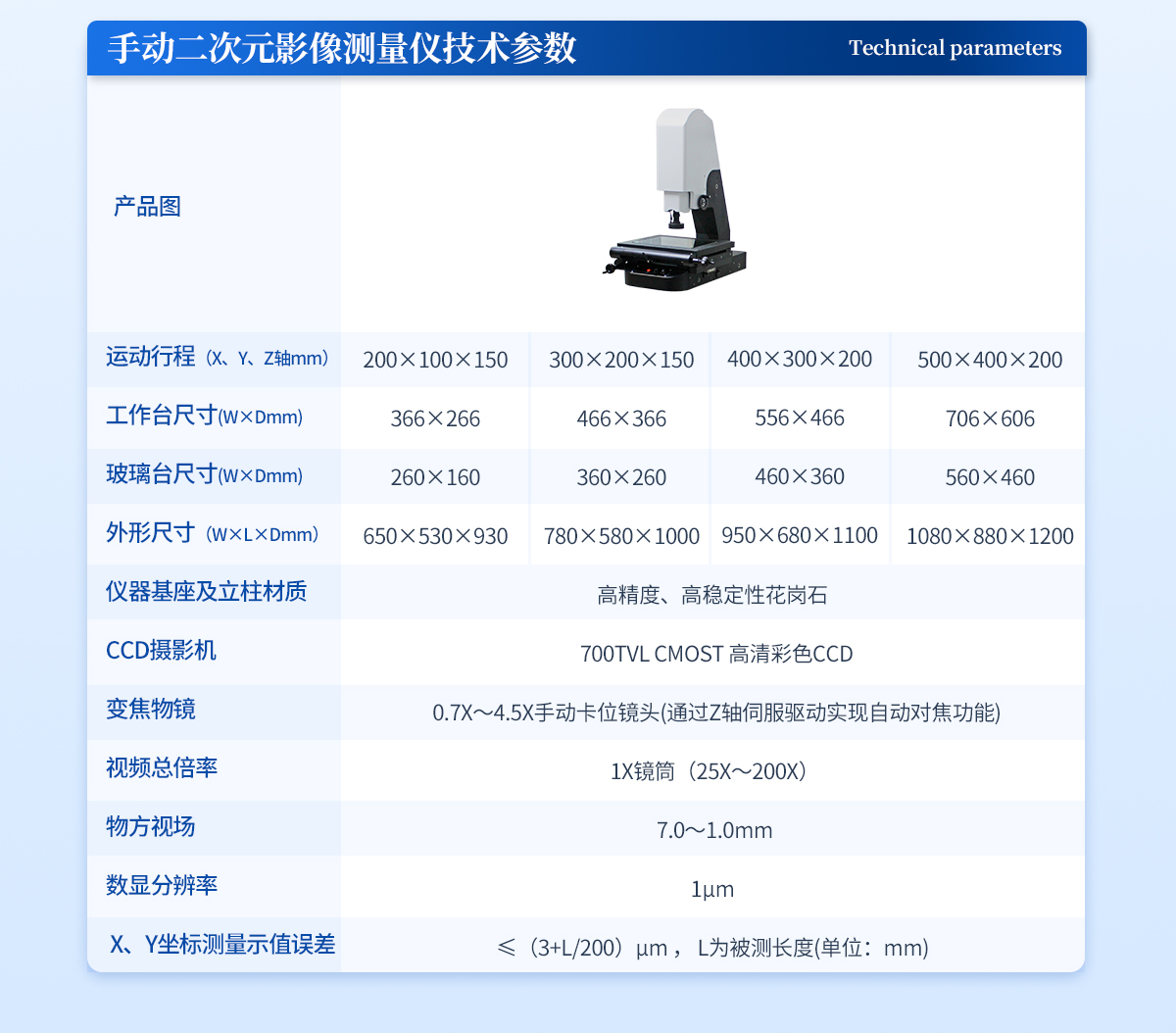 | 儀器基座 高穩(wěn)定性高精度花崗石材質(zhì) 1套 | CCD 700TVL COMST高清彩色CCD(COMST) 1個 | 鏡頭 0.7~4.5 X手動卡位鏡頭(萊斯) 1個 | 光柵尺 高精度位移傳感電子尺,分辨率:1μm (精微) 2條 | 導軌 咸陽藍博P級精密V型導軌(LB) 3組 | 傳動 西德無牙光桿精密傳動(西德)、高精密T型絲桿(特制) 3條 | 表面光源 LED恒流環(huán)形冷光源 1個 | 底光源 綠色單顆LED冷光源+雙組透鏡均光平行底光模組 1PCS | 數(shù)據(jù)采集卡 UWC3200 1PCS | 影像測量軟件 DTV 2.5T手動影像測量軟件 1套 | 光學校正片 DTV 定制 1塊 | 電纜 AC/DC 5條 | 電壓 AC :100-240V(全電壓) 1個 |