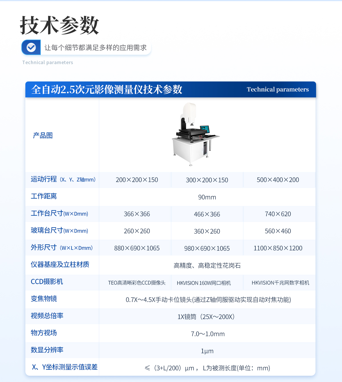 | l 運動行程(X、Y、Z軸mm):300×200×150 | l 工作臺呎寸(W×Dmm): 456×366 | l 玻璃臺呎寸(W×Dmm): 360×260 | l 外形尺寸(W×L×Dmm): 780×580×1000 | l 工作距離:90mm | l 儀器基座材質(zhì):高精度、高穩(wěn)定性花崗石 | l CCD攝影機:700TVL COMST高清彩色CCD | l 變焦物鏡: 0.7X~4.5X手動卡位鏡頭 | l 視頻總倍率:1X鏡筒(25X~200X) | l 物方視場: 7.0~1.0mm | l 數(shù)顯分辨率:1μm | l X、Y坐標測量示值誤差≤(3+L/200)μm , L為被測長度(單位:mm) |