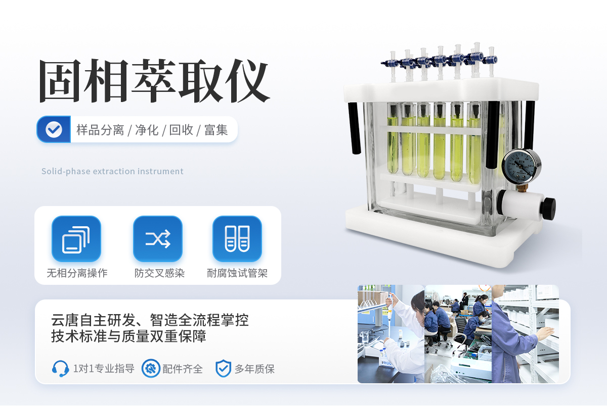 固相萃取儀是由液固萃取和液相色譜技術(shù)相結(jié)合發(fā)展而來,利用固體吸附劑將液體樣品中的目標(biāo)化合物吸附,與樣品的基體和干擾化合物分離,然后再用洗脫液洗脫或加熱解吸附,達(dá)到分離和富集目標(biāo)化合物的目的(即樣品的分離,凈化和富集),目的在于降低樣品基質(zhì)干擾,提高檢測(cè)靈敏度,其應(yīng)用于各類食品安全檢測(cè)、農(nóng)產(chǎn)品殘留監(jiān)控、醫(yī)藥衛(wèi)生、環(huán)境保護(hù)、商品檢驗(yàn)、自來水及化工生產(chǎn)實(shí)驗(yàn)室。