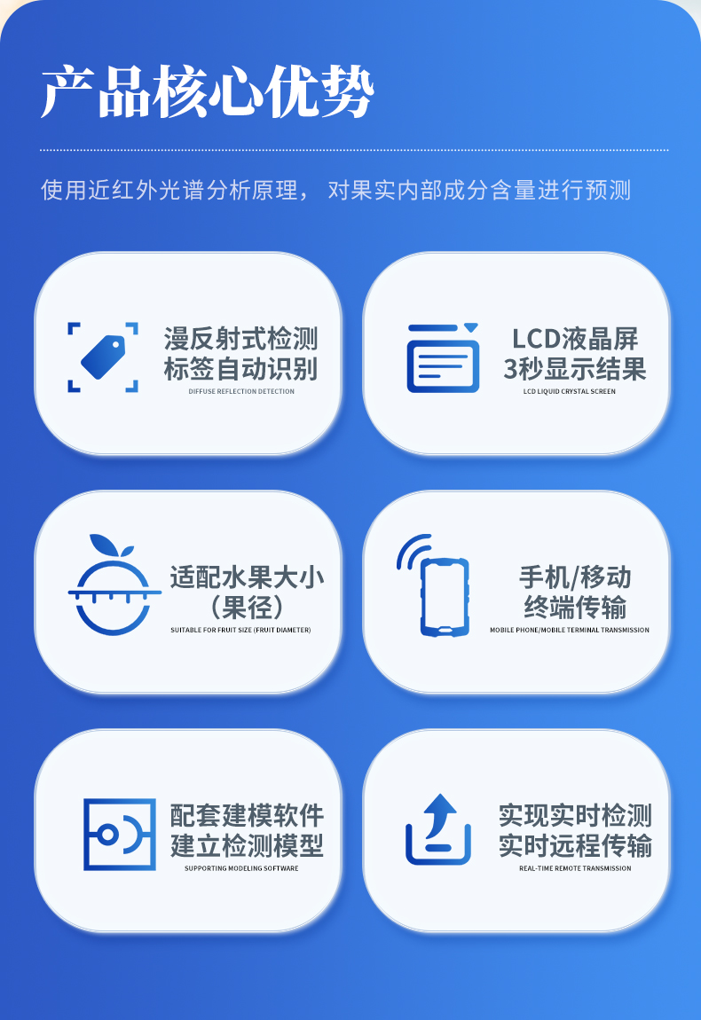 果實內部品質無損檢測儀,使用近紅外光譜分析原理, 對果實內部成分含 量進行預測。儀器由近紅外光譜儀、光源、處理器、顯示屏等組成。儀器光源發出近紅外光,使果實內部的分子振動并發生能級躍遷,進而產生近紅外光譜,因為近紅外光譜和果實品質方面的成分含量具有相關性(如糖度、干物質等),可通過數學算法建立相關品質信息的預測模型,因此,在預測未知的水果樣品時,只需要使用無損檢測儀去掃描它,獲取它的光譜信息,即可通過模型提供該水果樣品的品質預測結果。