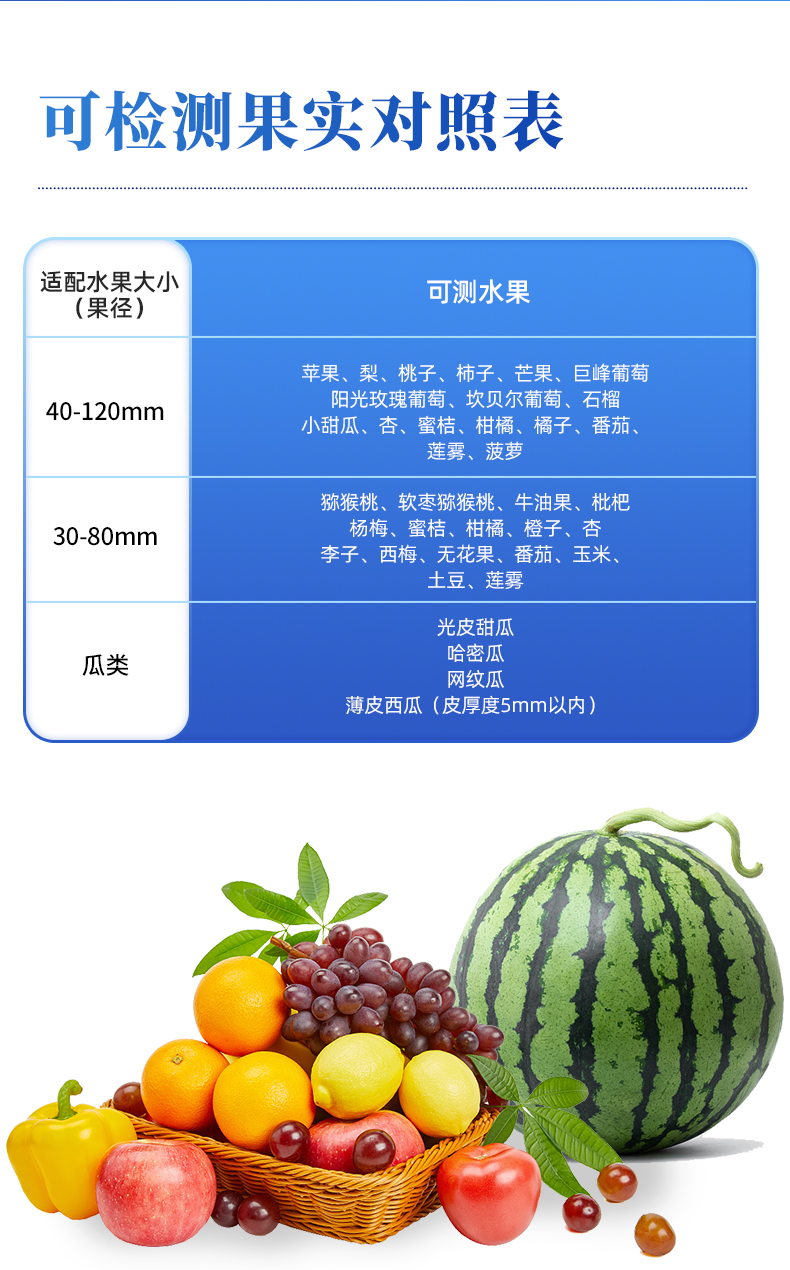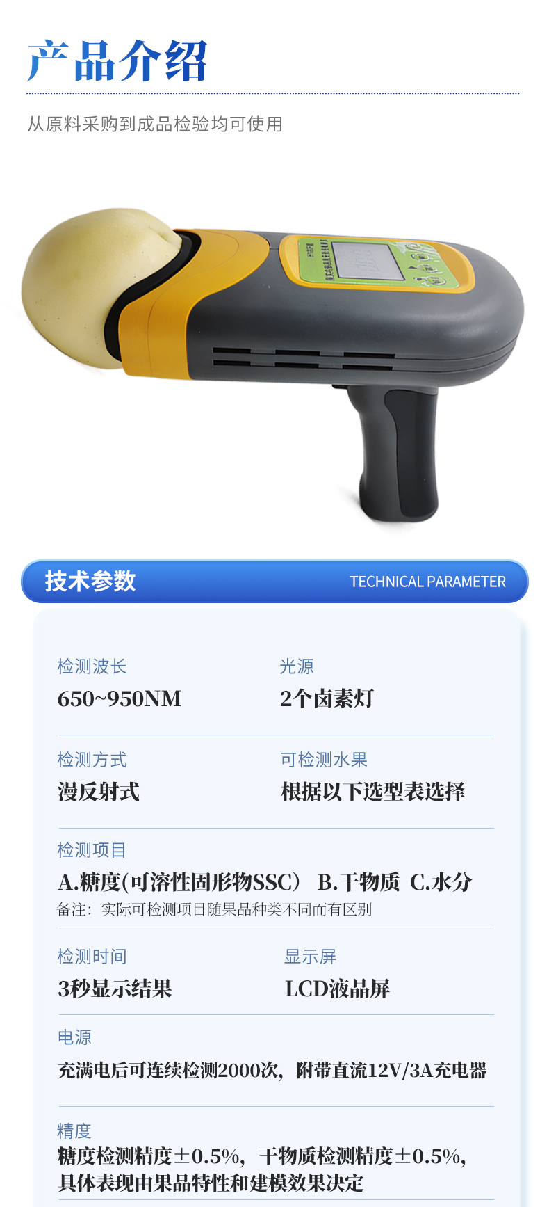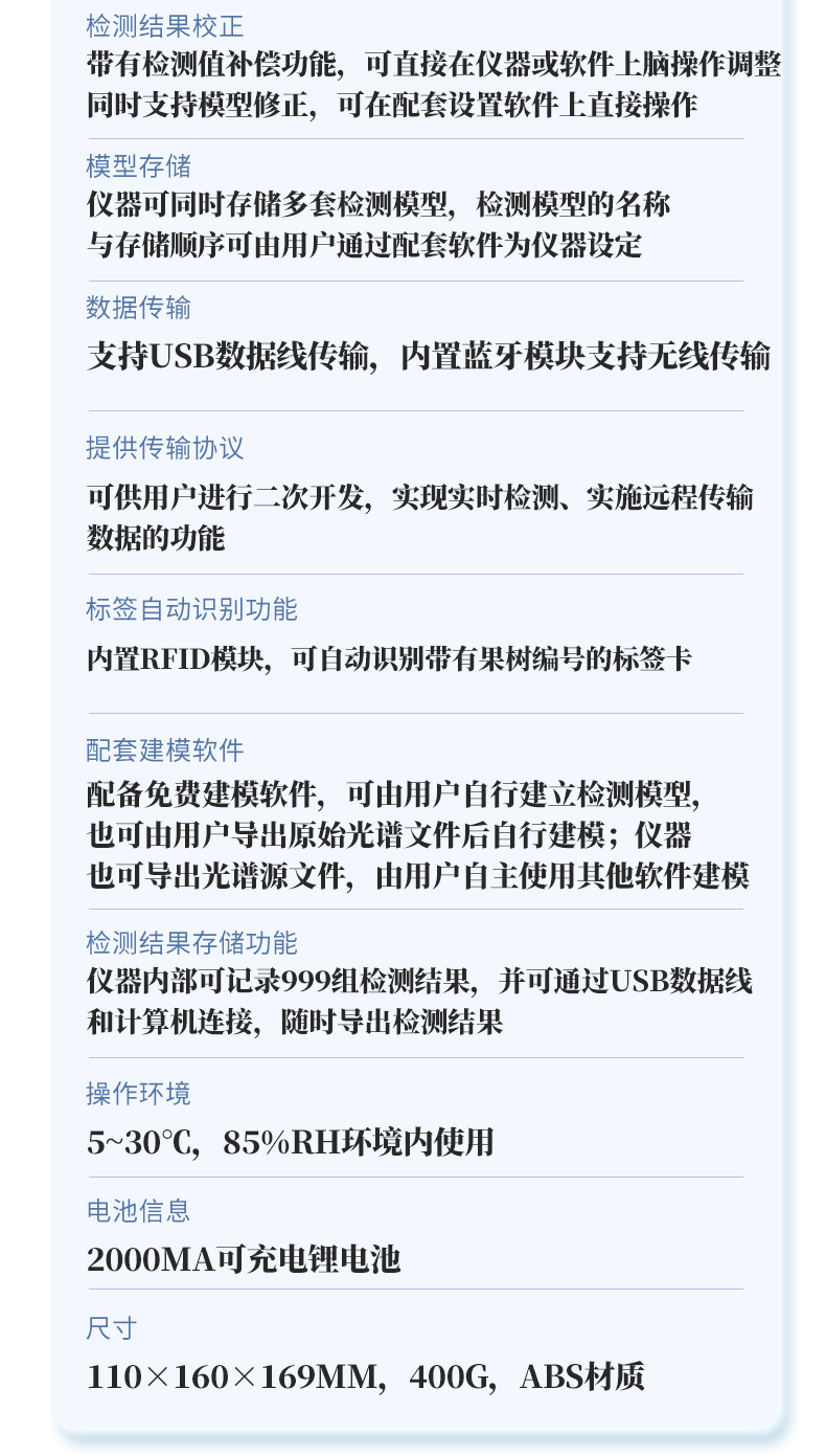 | 1.檢測波長:650~950nm; | 2.光源:2個鹵素燈; | 3.檢測方式:漫反射式; | 4.可檢測水果:根據以下選型表選擇 | 5.適配水果大?。ü麖剑篐100F型(40-120mm),H100C型(30-80mm),H100M型(瓜類) | 6.檢測項目: a.糖度(可溶性固形物SSC) b.干物質 c.水分 備注:實際可檢測項目隨果品種類不同而有區別 | 7.檢測時間:3秒顯示結果; | 8.電源:充滿電后可連續檢測2000次,附帶直流12V/3A充電器; | 9.精度:糖度檢測精度±0.5%,干物質檢測精度±0.5%,具體表現由果品特性和建模效果決定; | 10.檢測結果校正:帶有檢測值補償功能,可直接在儀器或軟件上腦操作調整;同時支持模型修正,可在配套設置軟件上直接操作; | 11.模型存儲:儀器可同時存儲多套檢測模型,檢測模型的名稱與存儲順序可由用戶通過配套軟件為儀器設定; | 12.數據傳輸:支持USB數據線傳輸,內置藍牙模塊支持無線傳輸; | 13.手機/移動終端傳輸功能:可將儀器檢測的結果實時傳輸到配套的手機APP并進行存儲,可在手機上導出存儲的所有檢測結果,儀器配套的手機APP為免費使用; | 14.提供傳輸協議,可供用戶進行二次開發,實現實時檢測、實施遠程傳輸數據的功能; | 15.標簽自動識別功能:內置RFID模塊,可自動識別帶有果樹編號的標簽卡; | 16.支持光譜信息存儲和導出; | 17.配套建模軟件:配備免費建模軟件,可由用戶自行建立檢測模型,也可由用戶導出原始光譜文件后自行建模;儀器也可導出光譜源文件,由用戶自主使用其他軟件建模; | 18.檢測結果存儲功能:儀器內部可記錄999組檢測結果,并可通過USB數據線和計算機連接,隨時導出檢測結果; | 19.操作環境:5~30℃,85%RH環境內使用 | 20.顯示屏:LCD液晶屏 | 21.電池信息:2000mA可充電鋰電池 | 22.尺寸:110×160×169mm,400g,ABS材質 | 23.附件:橡膠遮光罩,充電器,USB數據線,便攜箱,軟件(免費電子版) |