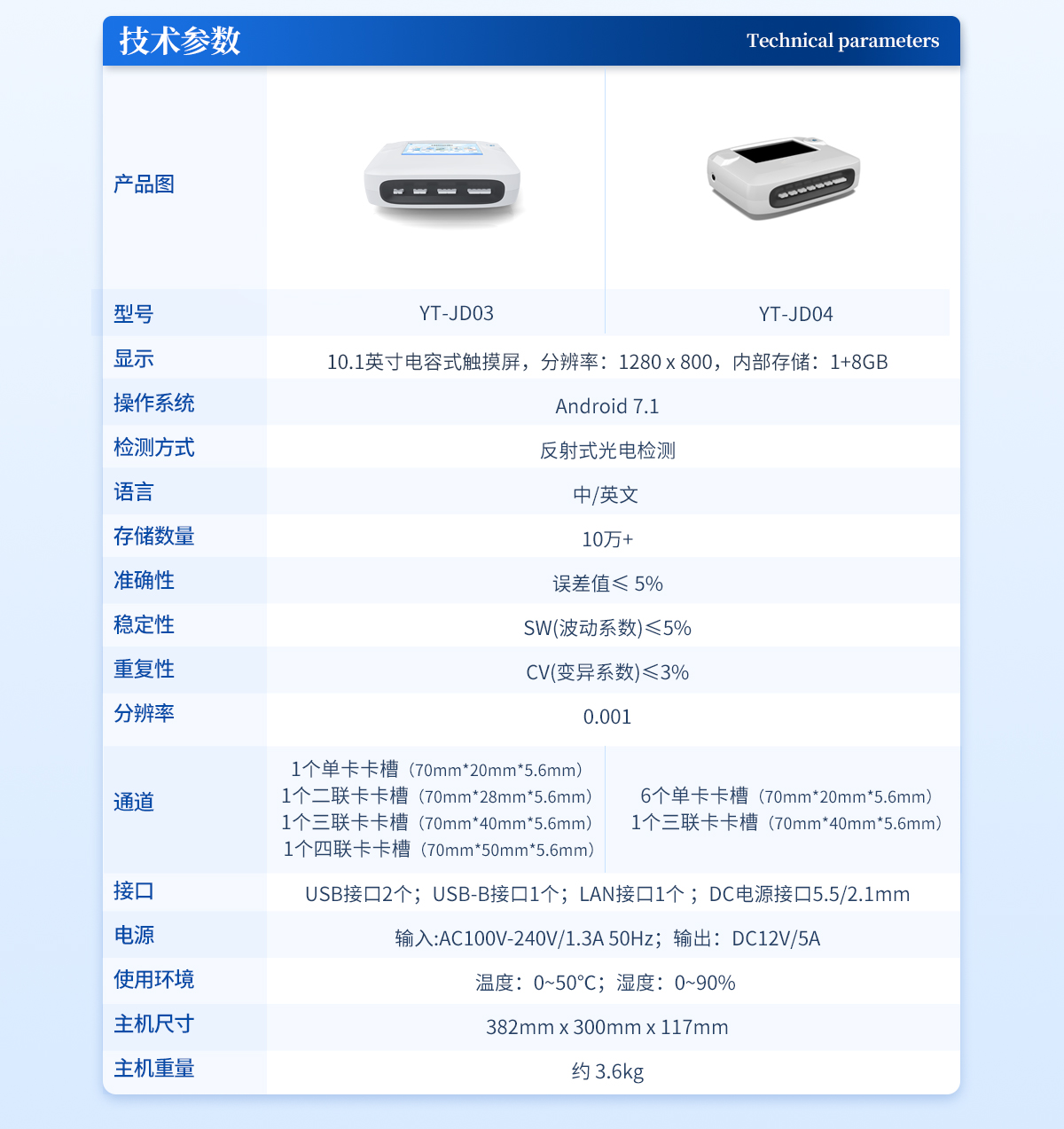 | 1、★ 10.1英寸電容式觸摸屏,分辨率:1280:x:800,內部存儲:1+8GB | 2、 操作系統:Android:7.1 | 3、 ★檢測方式:反射式光電 | 4、 語言:中/英文: | 5、 存儲數量:10萬+ | 6、 準確性:誤差值≤:5% | 7、 穩定性:SW(波動系數)≤5% | 8、 重復性:CV(變異系數)≤3% | 9、 分辨率:0.001 | 10、 ★通道:1個單卡卡槽(70mm*20mm*5.6mm);1個二聯卡卡槽(70mm*28mm*5.6mm);1個三聯卡卡槽(70mm*40mm*5.6mm);1個四聯卡卡槽(70mm*50mm*5.6mm) | 11、 檢測時間:<:5秒:(單卡及多聯卡);可對樣本進行檢測。<> | 12、 打印機:熱敏打印機(熱敏打印紙:57*30mm) | 13、 ★數據傳輸:WiFi、藍牙、USB、射頻讀卡、外置掃碼模塊(選配) | 14、 ★數據處理:可通過通訊端口進行數據匯總、上傳監管平臺等 | 15、 ★檢測通道孵育檢測一體,溫度范圍::室溫:+5℃:~:60℃ | 16、 ★接口:USB接口:2個;USB-B接口:1個;LAN接口:1個:;DC電源接口:5.5/2.1mm | 17、 電源:輸入:AC:220V:±:20V,:50Hz:±:1Hz;輸出:DC:12V,:5A | 18、 使用環境:溫度:0~50℃;濕度:0~90%: | 19、 主機尺寸::382mm:x:300mm:x:117mm | 20、 主機重量:約:3.6kg |