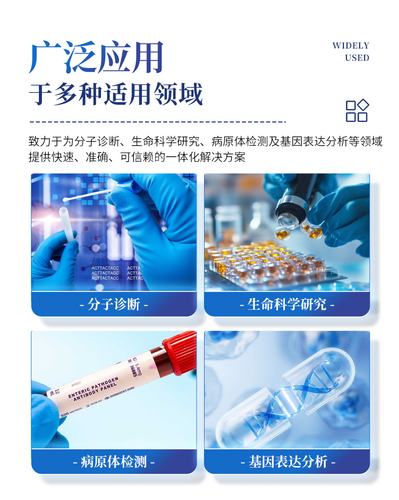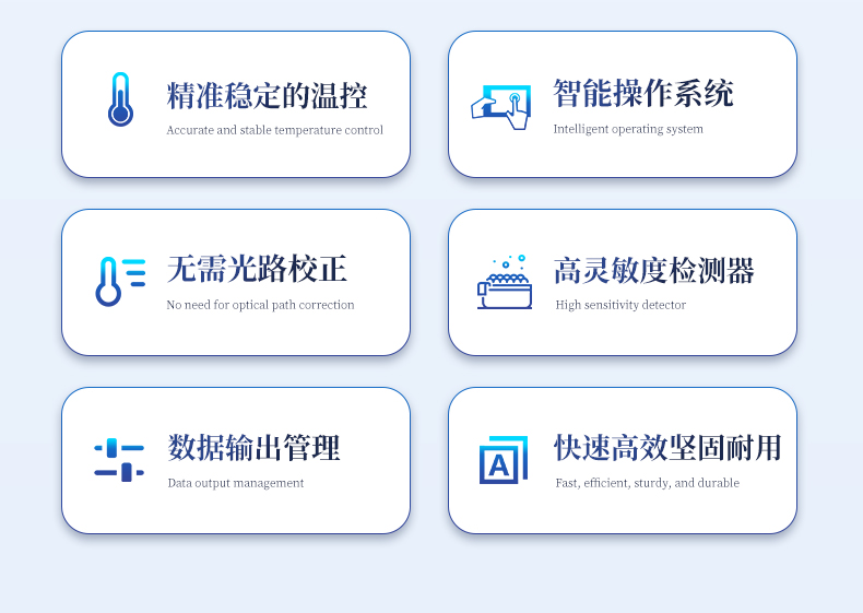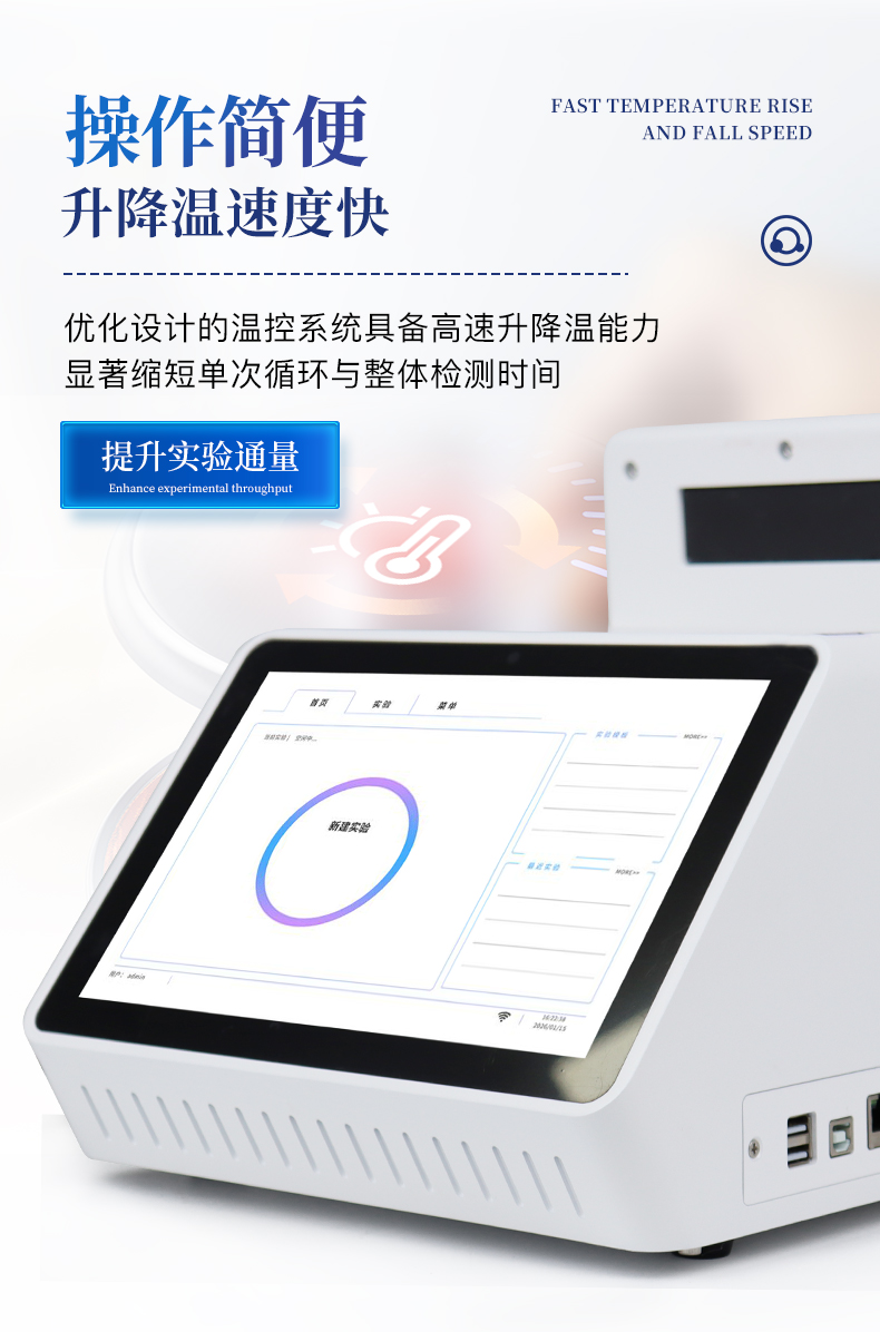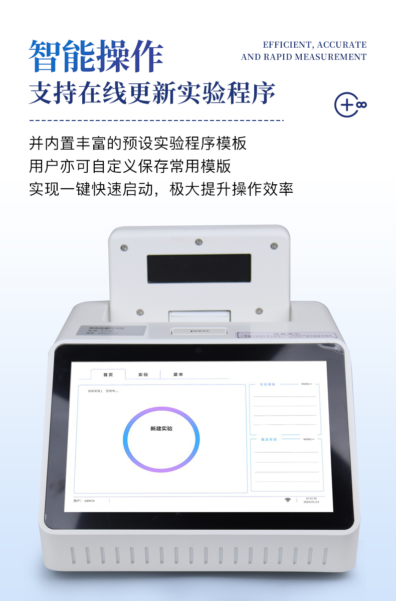 | 1.智能操作系統,實驗盡在掌握 | A程序更新與預設:支持在線更新實驗程序,并內置豐富的預設實驗程序模板,用戶亦可自定義保存常用模版,實現一鍵快速啟動,極大提升操作效率。 | B操作簡單:無論是觸摸屏界面還是電腦軟件,均設計得直觀易懂,新用戶也能快速上手。預置常用程序模板,進一步簡化操作流程。 | 2.精準穩定的溫控與光學核心 | A長久精準的溫控系統:采用進口***TEC半導體制冷模塊,控溫精準(±0.1°C),孔間溫度均勻性**(≤±0.3°C)。系統穩定性卓越,長期使用性能衰減小,校準周期長達數年,顯著降低維護成本與運營中斷。 | B免維護的靈敏光學系統:配備單個獨立LED光源與單個獨立光電二極管檢測器,采用超長壽命進口光源,設計壽命期內免維護,無需額外校準或更換,保障檢測結果長期一致性與高靈敏度。 | C卓越的數據質量:實驗線性相關性高(R2≥0.999),重復性優異(孔間CV值低),確保定量結果準確可靠,數據置信度高。 | 3.**便捷的數據與輸出管理 | A多重數據導出方式:支持通過USB存儲設備直接拷貝,或經由Wi-Fi無線網絡傳輸數據至本地服務器或云端,方便靈活,滿足各類實驗室數據管理習慣。 | B豐富的報告導出與打印:支持生成并導出多種格式(如PDF、Excel)的實驗報告。儀器兼容USB熱敏打印機、藍牙無線打印機及常規A4打印機,可直接在儀器上或通過電腦一鍵導出并打印專業報告,便于結果存檔與即時分享。 | 4.快速**與堅固耐用 | A升降溫速度快:優化設計的溫控系統具備高速升降溫能力,顯著縮短單次循環與整體檢測時間,提升實驗通量。 | B超長使用壽命:核心部件均選用工業級耐用材料與設計,整機運行穩定可靠,致力于為用戶提供長久的投資回報。 |