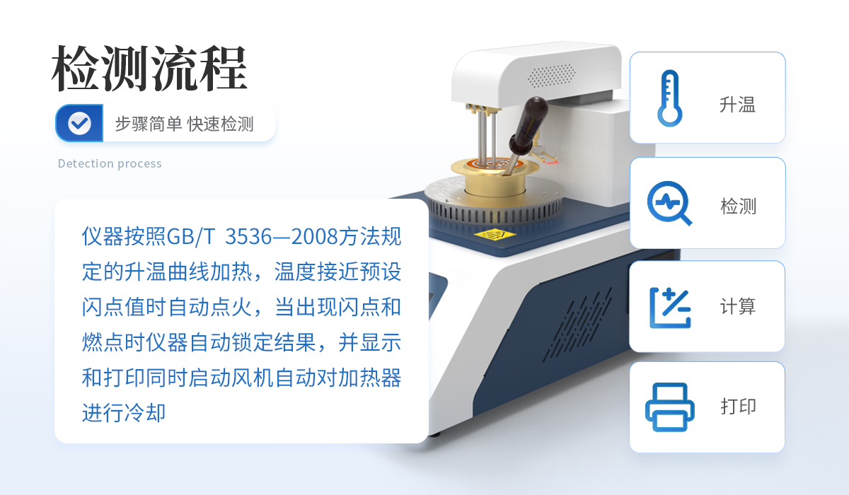 儀器按照GB/T 3536—2008方法規(guī)定的升溫曲線加熱,溫度接近預(yù)設(shè)閃點(diǎn)值時(shí)自動點(diǎn)火,當(dāng)出現(xiàn)閃點(diǎn)和燃點(diǎn)時(shí)儀器自動鎖定結(jié)果,并顯示和打印,同時(shí)啟動風(fēng)機(jī)自動對加熱器進(jìn)行冷卻。