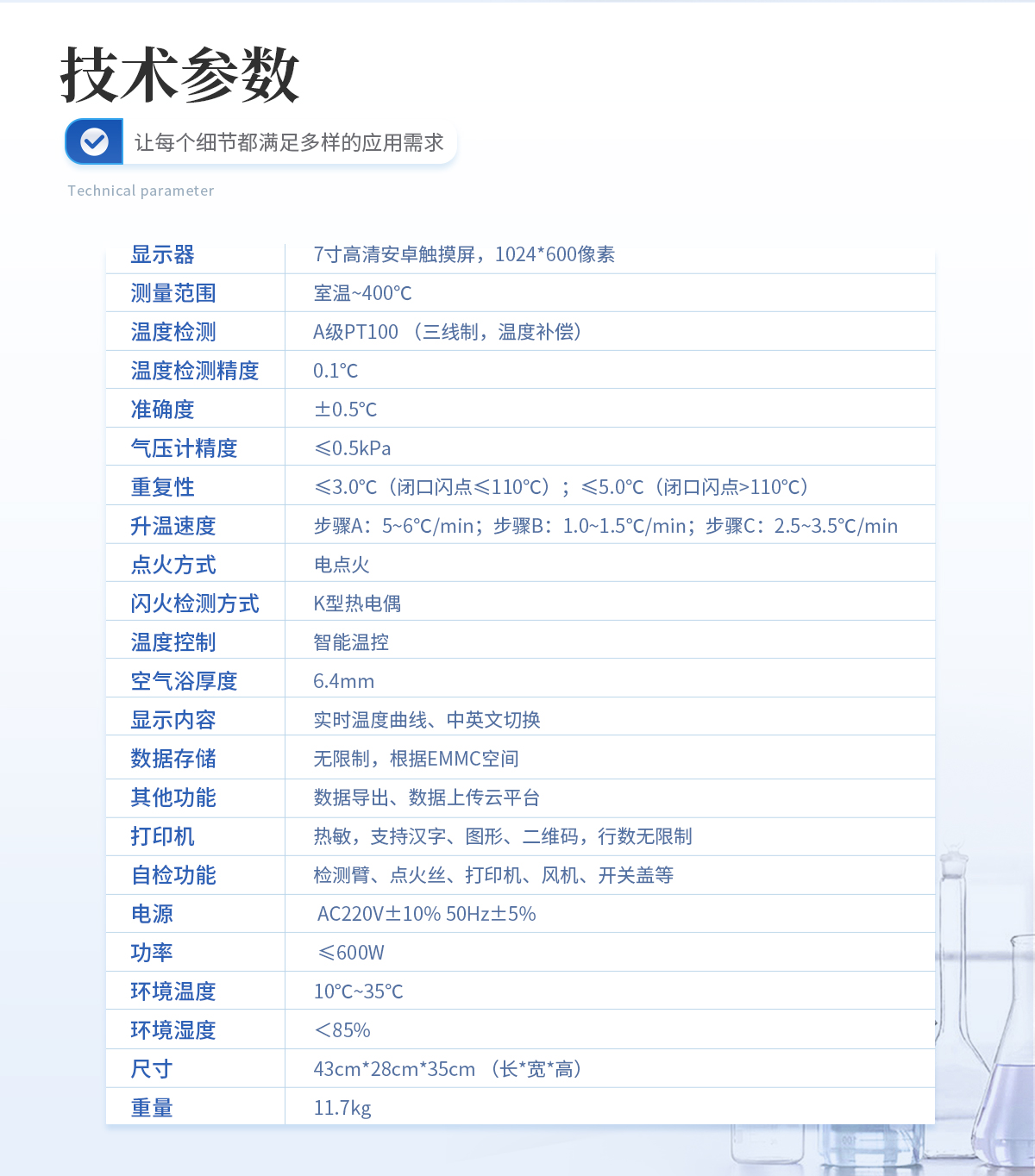 | 顯示器 7寸高清安卓觸摸屏,1024*600像素 | 測量范圍 室溫~400℃ | 溫度檢測 A級PT100 (三線制,溫度補(bǔ)償) | 溫度檢測精度 0.1℃ | 氣壓計(jì)精度 ≤0.5kPa | 重復(fù)性 ≤4℃ | 升溫速度 預(yù)期閃點(diǎn)56℃前為14℃-17℃/min;預(yù)期閃點(diǎn)前23℃開始為5℃-6℃/min. | 點(diǎn)火方式 電點(diǎn)火 | 閃火檢測方式 火焰離子檢測 | 燃點(diǎn)功能 自動鎖定燃點(diǎn)值 | 冷卻方式 強(qiáng)制風(fēng)冷 | 溫度控制 智能溫控 | 顯示內(nèi)容 實(shí)時(shí)溫度曲線、中英文切換 | 數(shù)據(jù)存儲 無限制,根據(jù)EMMC空間 | 其他功能 數(shù)據(jù)導(dǎo)出、數(shù)據(jù)上傳云平臺 | 打印機(jī) 熱敏,支持漢字、圖形、二維碼,行數(shù)無限制 | 自檢功能 檢測臂、劃掃桿、點(diǎn)火絲、打印機(jī)、風(fēng)機(jī)等 | 電源 AC220V±10% 50Hz±5% | 功率 ≤600W | 環(huán)境溫度 10℃~35℃ | 環(huán)境濕度 <85% | 尺寸 43cm*28cm*35cm (長*寬*高) | 重量 11.3kg |