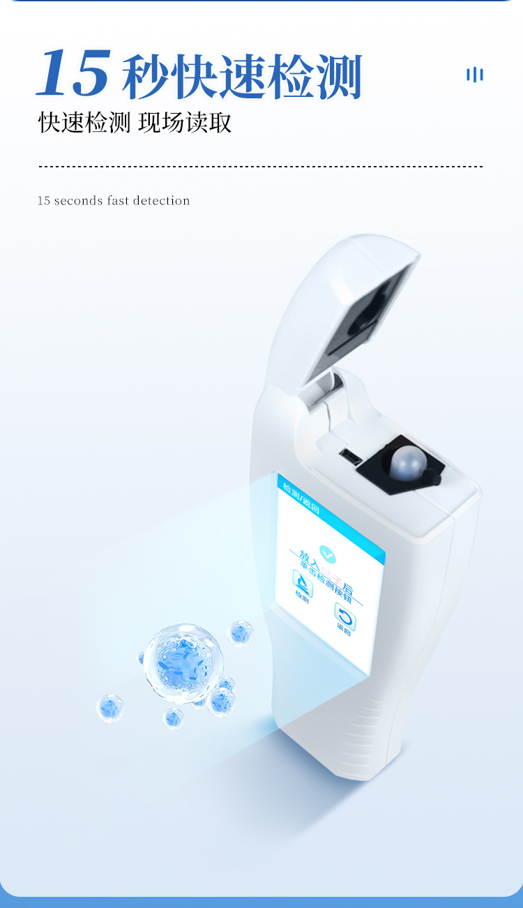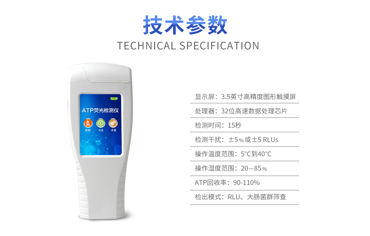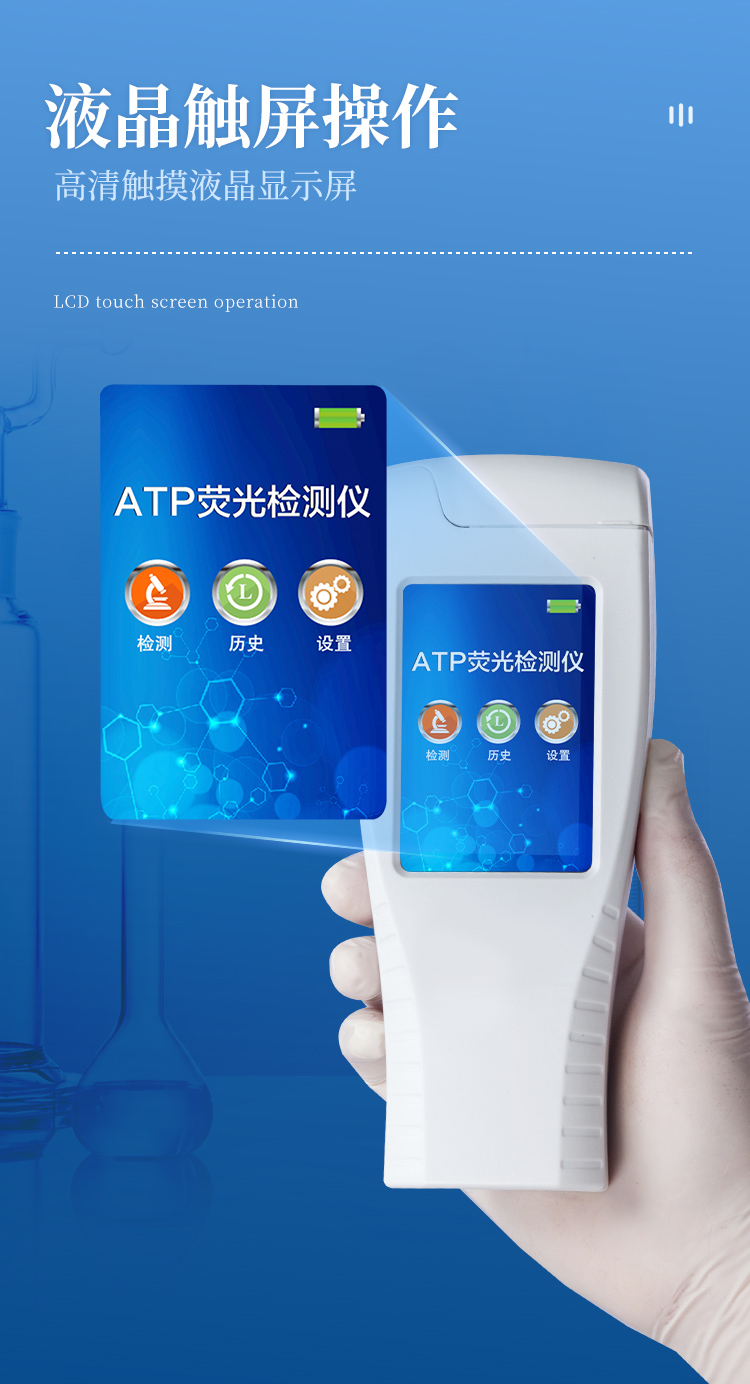 該設備為全新升級產品,大屏幕觸摸顯示屏,代替傳統按鍵。操作采用生物化學反應方法檢測ATP含量,ATP熒光檢測儀基于螢火蟲發光原理,利用“熒光素酶—熒光素體系”快速檢測三磷酸腺苷(ATP)。ATP拭子含有可以裂解細胞膜的試劑,能將細胞內ATP釋放出來,與試劑中含有的特異性酶發生反應,產生光,再用熒光照度計檢測發光值,微生物的數量與發光值成正比,由于所有生物活細胞中含有恒量的ATP,所以ATP含量可以清晰地表明樣品中微生物與其他生物殘余的多少,用于判斷衛生狀況。