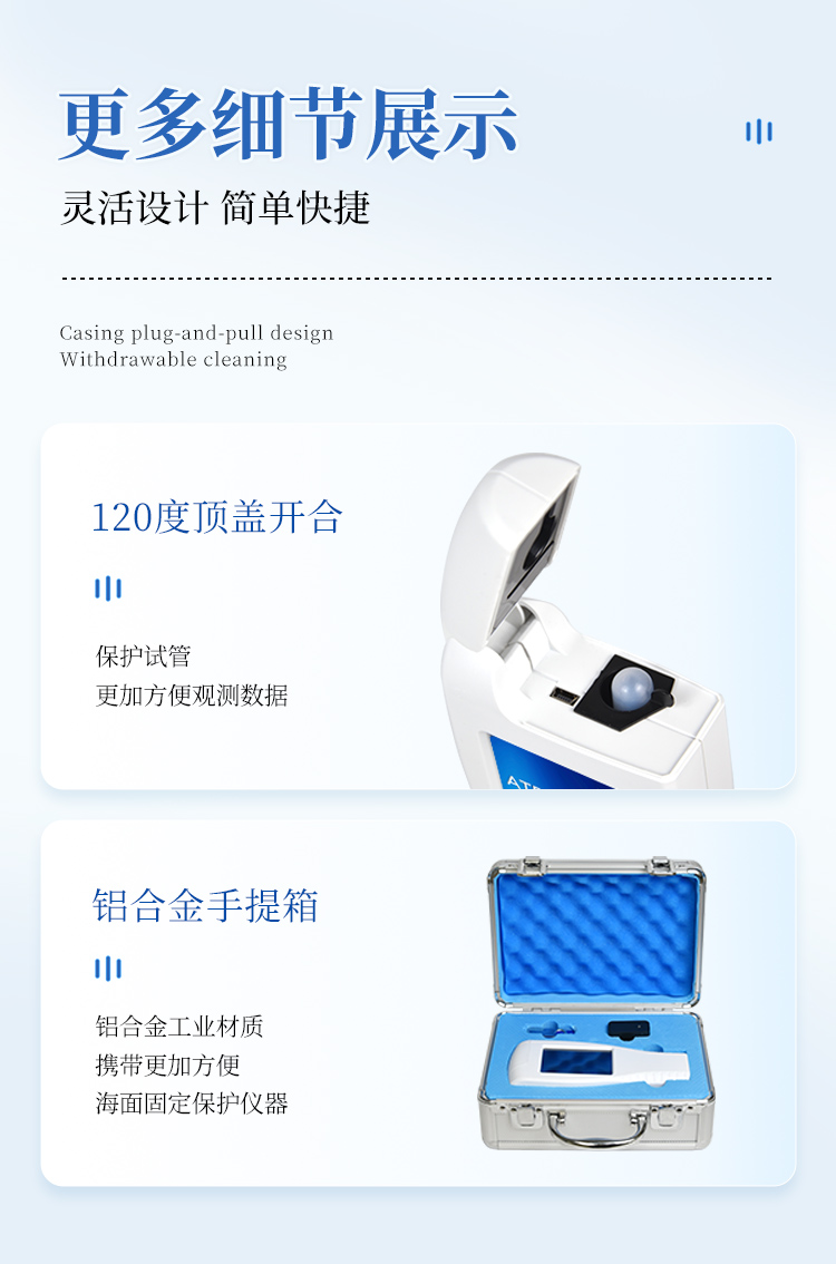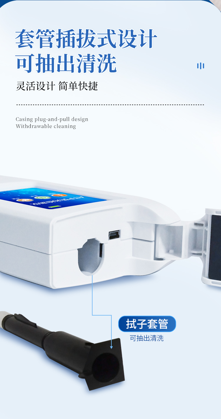 | 實用性 —— 可根據環境檢測需求設定上下限值,做到數據快速評估預警,表面潔凈度快速篩查。 | 靈敏度高 —— 10-15~10-18 mol | 速度快 —— 常規培養法18-24h以上,而ATP只需要十幾秒鐘 . | 可行性 —— 微生物數量與微生物體內所含ATP有明確的相關性。 通過檢測ATP含量,可間接得出反應中微生物數量 | 可操作性 —— 傳統培養方法需要在實驗室由經過培訓的技術人員進行操作;而ATP快速潔凈度檢測操作非常簡便,只需簡單的培訓即可由一般工作人員進行現場操作。 | 體驗更好 —— 試子套管采用插拔式靈活設計,可定期清洗長期使用,延長儀器壽命。 |