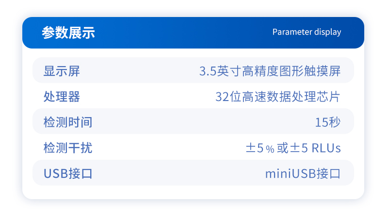 | 顯示屏:3.5英寸高精度圖形觸摸屏 | 處理器:32位高速數據處理芯片 | 檢測精度:1×10-18mol | 大腸菌群:1-106cfu | 檢測范圍:0 to 99999 RLUs | 檢測時間:15秒 | 檢測干擾:±5﹪或±5 RLUs | 操作溫度范圍:5℃到40℃ | 操作濕度范圍:20—85﹪ | ATP回收率:90-110% | 檢出模式:RLU、大腸菌群篩查 | 50個用戶ID 設定 | 可設定的結果限值個數:251個 | 自動判斷合格與不合格 | 自動統計合格率 | 內置自校光源 | 開機30秒自檢 | 配有miniUSB接口,可將結果上傳至PC | 配備專用軟件驅動U盤代替傳統光盤 | 儀器尺寸(W×H×D):188 mm×77mm×37mm | 使用可充電鋰電池免電池更換 | 備用狀態(20℃):6個月 | 中文操作手冊 | 穩定的液體熒光素酶 | 潤濕的一體化采集拭子 |