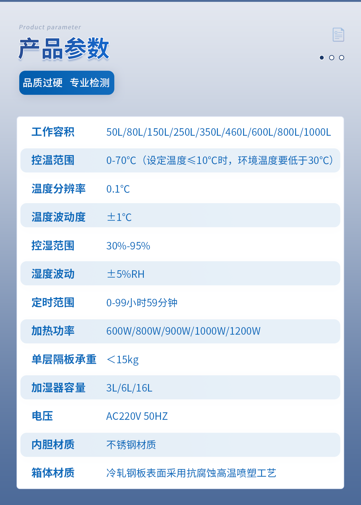 | 工作容積:360L | 控溫范圍:0-70℃(設定溫度≤10℃時,環境溫度要低于30℃) | 程序控制:24段 | 溫度分辨率:0.1℃ | 溫度波動度:±0.5℃ | 控濕范圍:30%-95% | 濕度波動:±5%RH | 定時范圍:0-99小時59分鐘 | 加熱功率:900W | 內箱尺寸 寬*深*高(cm):60*60*100 | 外箱尺寸 寬*深*高(cm):77*84*162 | 隔板層數(標配):2層 | 層間隔/mm:43 | 卡槽層數:15 | 加濕器容量(標配):3L | 單層隔板承重:<22kg | 底部總承重:35kg | 電壓:AC220V 50HZ | 整機重量:112kg | 內膽材質:8K鏡面不銹鋼 | 箱體材質:冷軋鋼板表面采用抗腐蝕高溫噴塑工藝 | 旗艦款升級項目:升級內置鋼化玻璃門,內置220V電源插座。 |