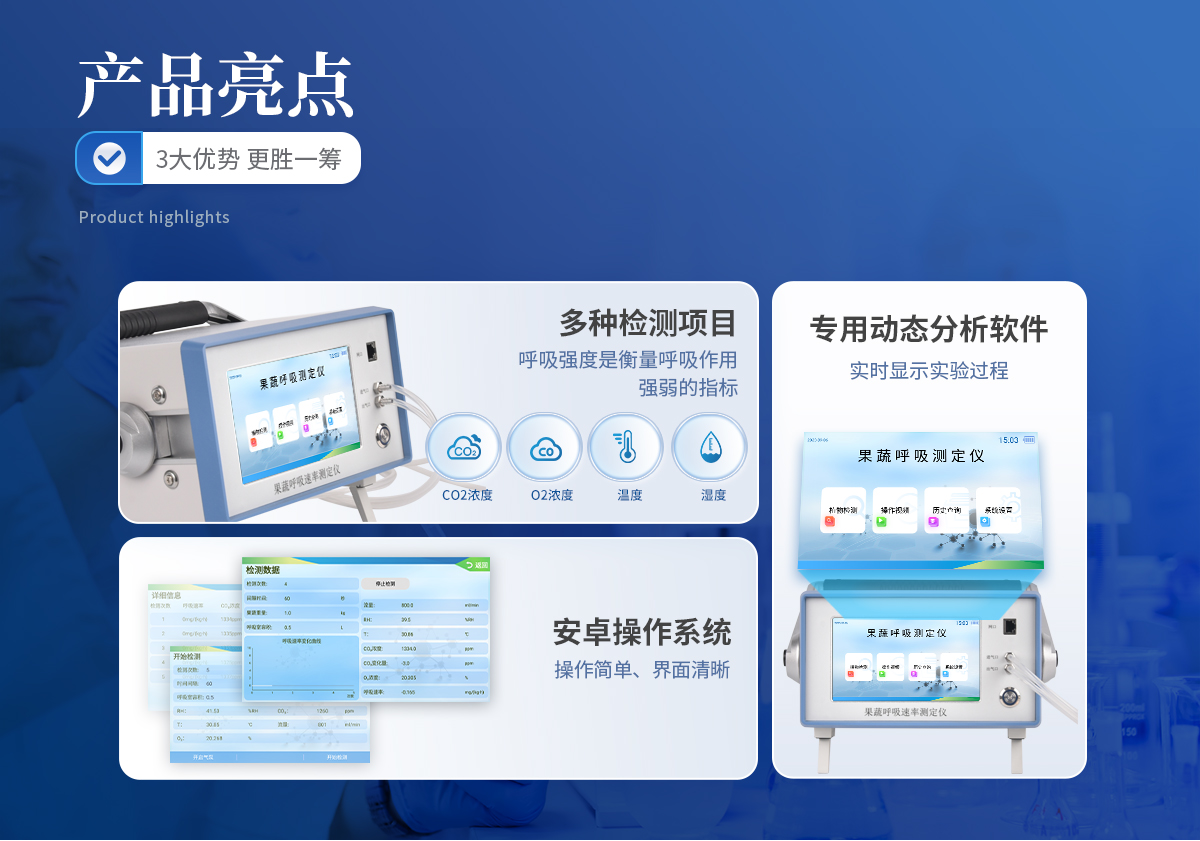 該儀器的特點(diǎn)是可以根據(jù)果蔬的大小來選擇不同體積的呼吸室,加快了平衡和測定時(shí)間;可以直接操顯示呼吸室的CO2濃度、O2濃度、溫度和濕度及變化曲線。